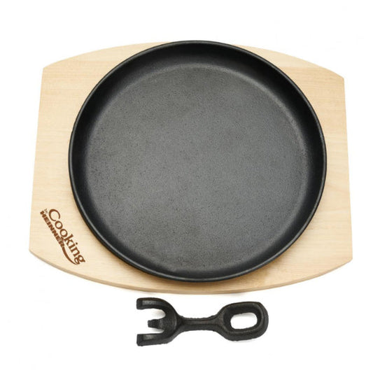 Platou servire rotund, fonta pura, cu maner si baza din lemn