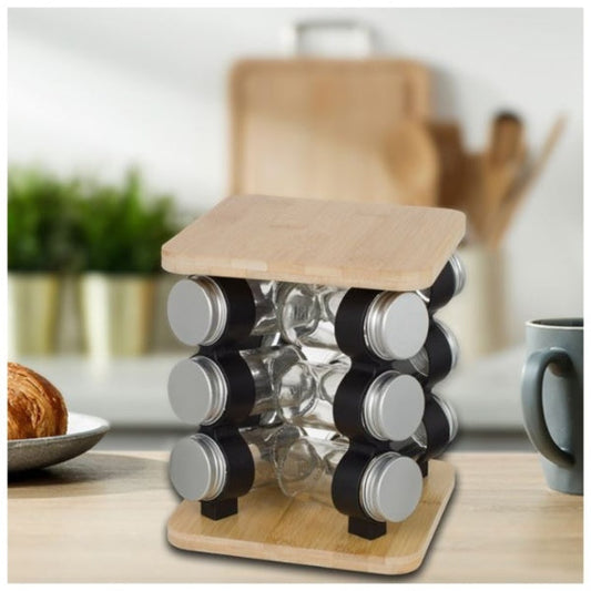 Suport rotativ pentru condimente din lemn cu 12 recipiente din sticla