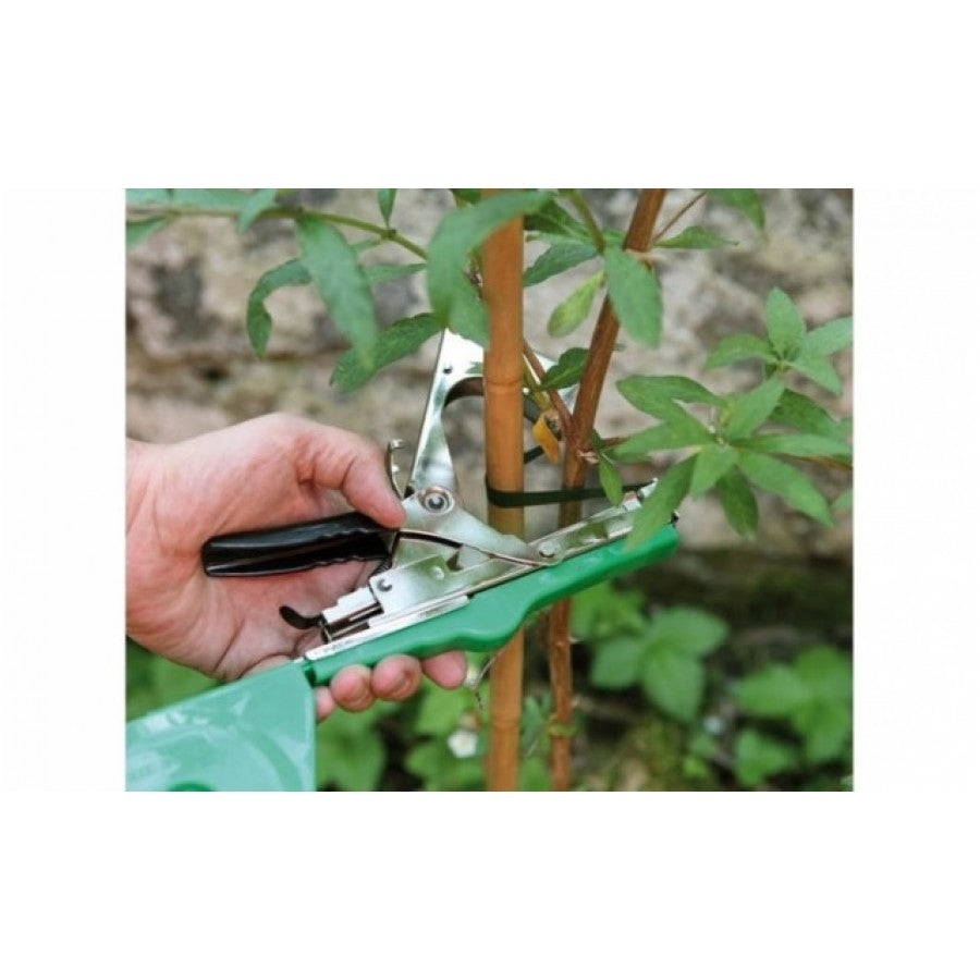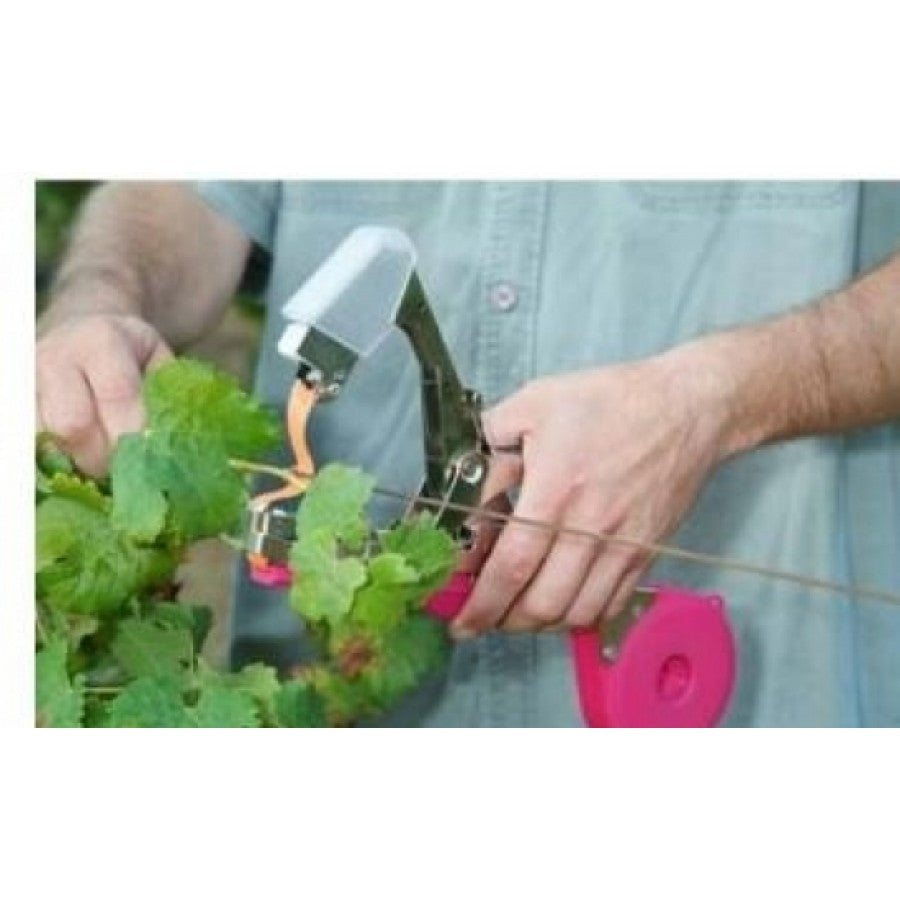Aparat de legat cu banda pentru vita de vie si legume:Capsatorul este destinat atasarii plantelor sau legarii lor de stalpi sau sarme.• Poate fi folosit pentru fixarea tulpinilor unor plante precum vita de vie, rosiile, castravetii sau alte plante agatatoare.• Economiseste timp: legarea plantelor se face mult mai rapid comparativ cu legarea manuala.• Plantele sunt prinse astfel mai bine si in acelasi timp, reduceti consumul benzilor de plastic.Eficienta unui lucrator experimentat care leaga cu un astfel de aparat este de 3 ori mai mare in comparatie cu a unui lucrator care leaga clasic. Specificatii:-dimensiuni: 158 mm H x 29 mm l x 355 mm L;-greutate: 530 grame;-limita legare: max. 45mm diam;-lama: lama zimtata pentru taiere banda; Aparatul foloseste banda si capse ca material consumabile.