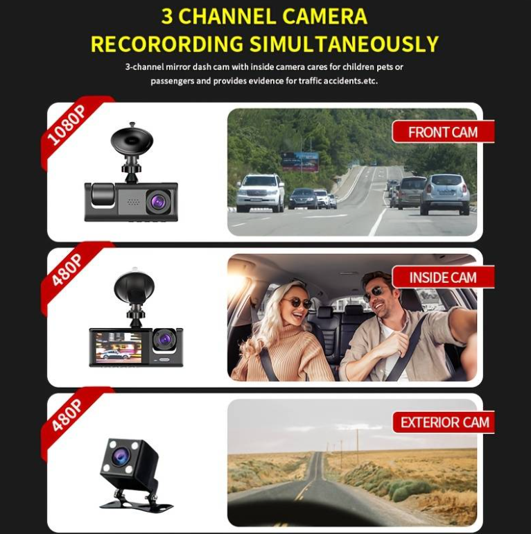 Camera auto tripla FullHD, 3 camere-fata/spate/interior, ecran 2'', G Senzor