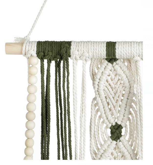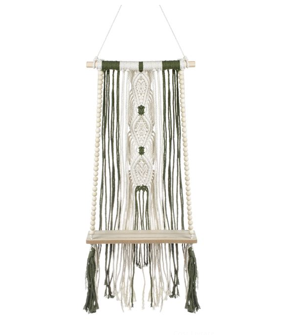 Raft decorativ suspendabil din lemn 25x13cm cu spate macrame din fire de bumbac de culoare alba si verde inchis, cu margele mici din lemn si franjuri lungi .