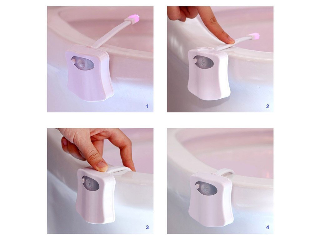 Usor de instalat si extrem de util pentru toate categoriile de varsta, de la copii la varstnici, noul dispozitiv LED pentru vasul de toaleta iti ofera, atunci cand este activat gratie senzorului infrarosu, clipe de confort si siguranta in propria baie. Atunci cand este activat noaptea, dispozitivul LED lumineaza intr-un mod placut vasul de toaleta, fara sa irite ochii asa cum ar face-o un bec aprins in toiul noptii. Caracteristici:-senzor de lumina si senzor de miscare;-LED-ul se aprinde doar daca in incapere este intuneric si este detectata miscare;-LED-ul se aprinde in 8 culori, fiecare culoare dureaza aproximativ 15 secunde;-2 setari de iluminare: o singura culoare sau schimb de culori (fiecare culoare dureaza aproximativ 15 secunde);-material: plastic;-usor de curatat;-perfecta pentru toaleta de acasa, pentru restaurante, cafenele, cluburi, etc;-voltaj: 4.5V;-putere: 1W;-functioneaza cu 3 baterii AAA (neincluse);-senzorul functioneaza pe o distanta de pana la 2m;-dimensiuni: 6.8*6.7*1.7cm;-rezistent la apa.