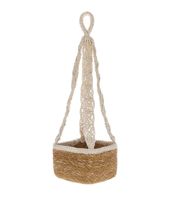 Masca ghiveci flori, impletita, patrata, cu interior din plastic, finisaj macrame si sfori (52cm)