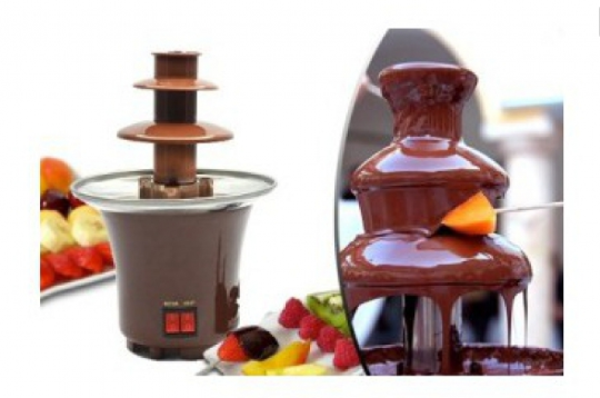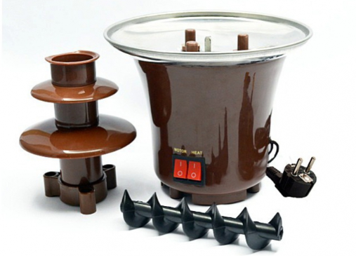 Fantana de ciocolata va permite savurarea deliciosului desert alaturi de fructe sanatoase si gustoase.Copiii vor fi incantati de desertul rezultat din aceasta fantana, fructe, bezele, biscuit, piscoturi sau napolitate, toate imbracate in delicioasa ciocolata. Instructiuni de utilizare:- se aseaza fantana pe o masa stabila;- se porneste fantana de ciocolata pentru a se incalzi platoul unde urmeaza sa se puna ciocolata si se lasa aproximativ 5 minute, ianinte sa se adauge ciocolata;- pentru un rezultat impresionant se foloseste doar ciocolata speciala pentru fantani de ciocolata;- ciocolata trebuie sa fie topita complet inainte sa se adauge in baza fantanii;- daca ciocolata este slaba in grasimi, adaugati unt sau ulei, pentru a obtine o textura fluida;- dupa ce se incalzeste platoul se pune ciocolatata pana la limita maxima a acestuia;- se porneste motorul fantanii de ciocolata care va impinge ciocolata prin tubul cu spirala in partea superioara a fantanii de unde va curge ca o fantana;- lasati sa se scurga timp de 2 minute, dupa care inchideti motorul pentru 30 minute, pentru a elimina eventualele bule de aer;- daca ciocolata nu se scurge corespunzator, adaugati putin ulei.- puteti achizitiona ciocolata din magazine si supermarketuri si o puteti prepara in functie de compozitia acesteia; Caracteristici tehnice:Putere: 65 W;Se alimenteaza la 230V;Dimensiuni : 14,5 x 22 cm.;Realizata din otel inoxidabil satinat si plastic rezistent la caldura;2 Nivele de scurgere a ciocolateicapacitate de pana la 300g ciocolataUsor de utilizat si curatat.