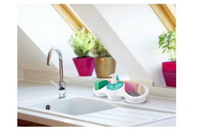 Organizeaza bucataria cu acest suport util pentru un acces facil la accesoriile pentru spalat.Acest organizator 3 in 1 contine un dozator de detergent lichid pentru spalat vase iar in spatiile pentru depozitare se pot pastra bureti, perii, lavete sau bureti de sarma.Organizatorul este dotat cu spatiu special pentru pastrarea inelelor in timpul spalatului. Material: plastic.Culoare: AlbDimensiuni (LxAxI): 28,5 x11x13 cm