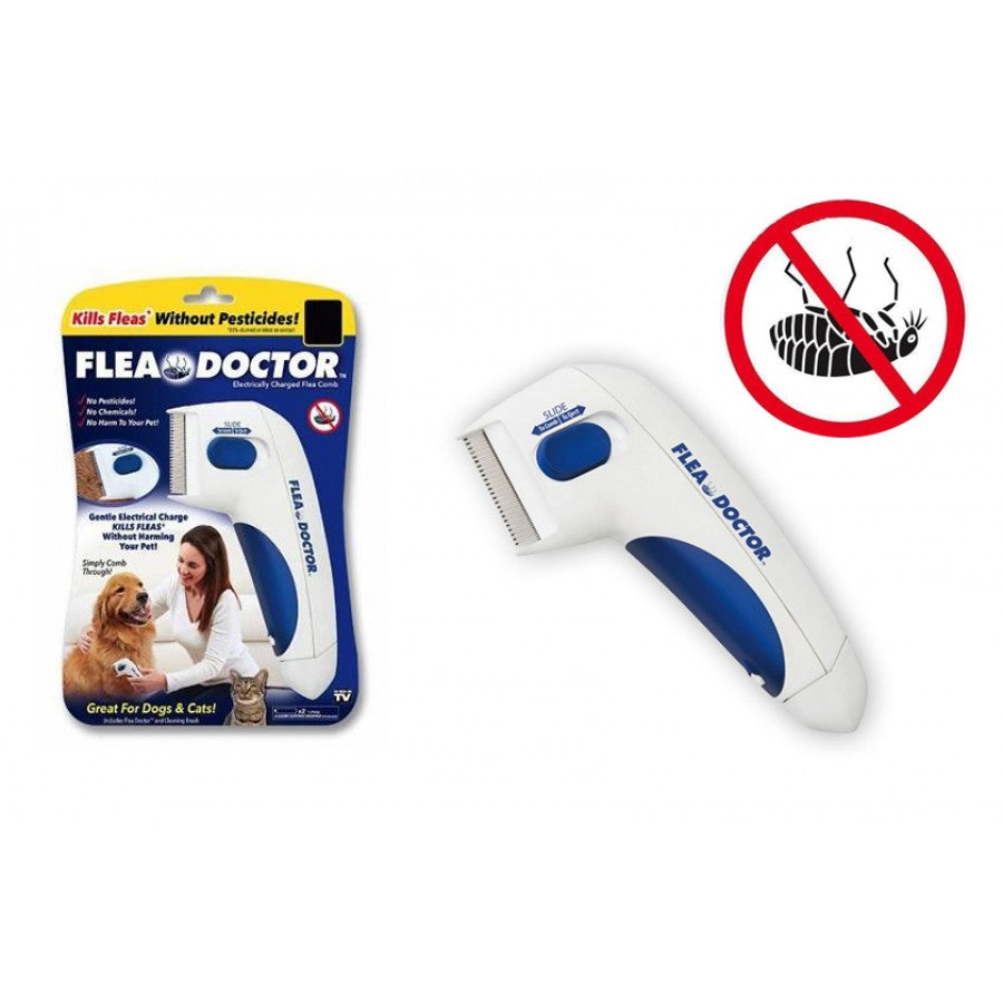 Dispozitivul Flea Doctor este proiectat astfel incat sa ajunga adanc in blana animalutului tau si sa omoare puricii.DescriereCu acest pieptene veti ucide in timpul pieptanarii toti puricii si alti paraziti, fara niciun mijloc chimic.Este de ajuns sa perii blana companionului pentru ca FLEA DOCTOR sa actioneze!Intre dintii pieptenului are loc o descarcare slaba electrica care ucide toti parazitii de piele, dar care nu pune in pericol sanatatea animalului de companie.Pieptenul este conceput astfel incat in timpul pieptanarii sa nu intre in contactat cu pielea cainelui.Functioneaza cu 2 baterii tip AA;ATENTIE: bateriile nu sunt incluse