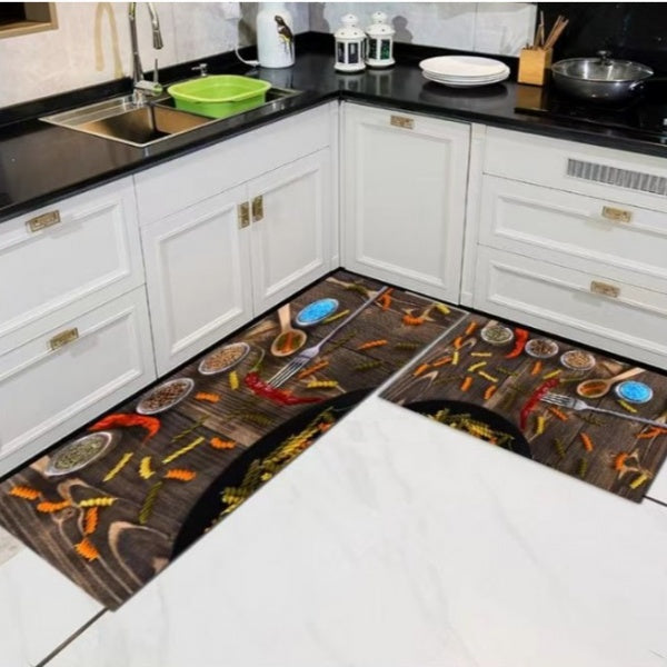 Acest set de două covoare de bucătărie este ideal pentru a aduce confort și stil în bucătăria ta. Fiecare covor este confecționat din materiale durabile și ușor de întreținut, fiind perfect pentru a proteja podeaua de stropi, murdărie și uzura zilnică.
