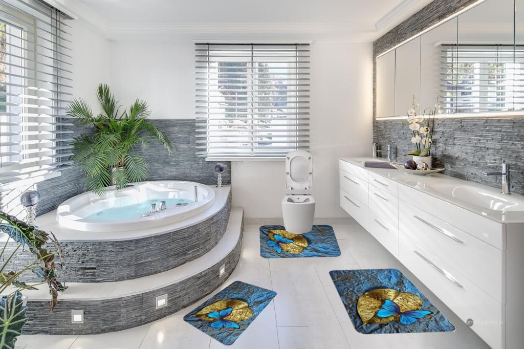 Pachetul de livrare include 1 covoras pentru baie, 1 covoras pentru suportul de la chiuveta, 1 covoras pentru wc