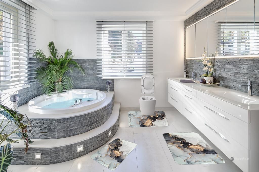 Pachetul de livrare include 1 covoras pentru baie, 1 covoras pentru suportul de la chiuveta, 1 covoras pentru wc