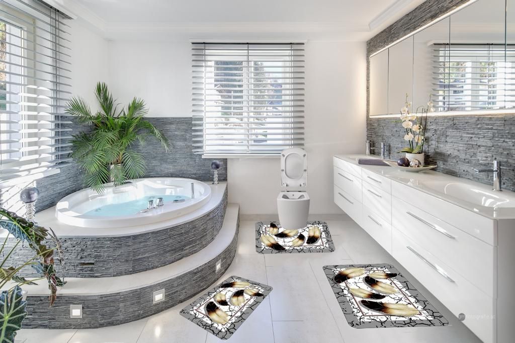 Pachetul de livrare include 1 covoras pentru baie, 1 covoras pentru suportul de la chiuveta, 1 covoras pentru wc