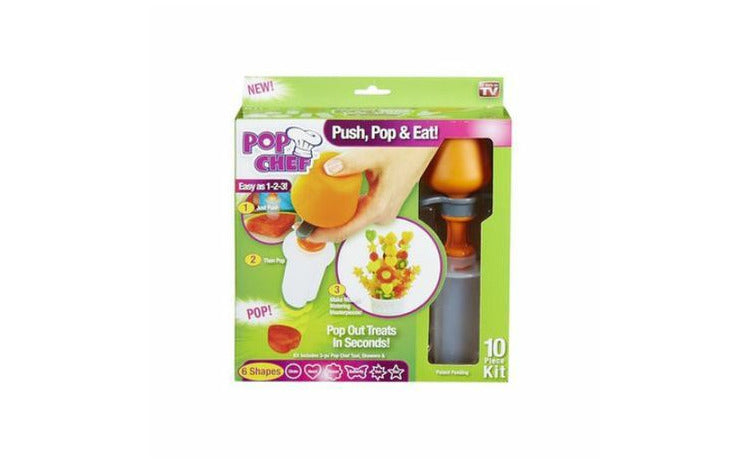Pop chef este usor de folosit, doar impingeti, apoi apasati pentru a forta aerul si veti realiza astfel capodopere delicioase. Creati gustari sanatoase, si transformati masa intr-o distractie.Cu Pop chef masa este gata in cateva secunde, astfel incat toata lumea se poate bucura de cadouri festive in forma de inima, aranjamente luminoase de fructe proaspete, branzeturi delicioase, biscuiti si multe altele.Pachetul contine: pop chef, 6 forme pentru taiere (inima, stea, cerc, fluture, floare, soare), 10 bete bambus.