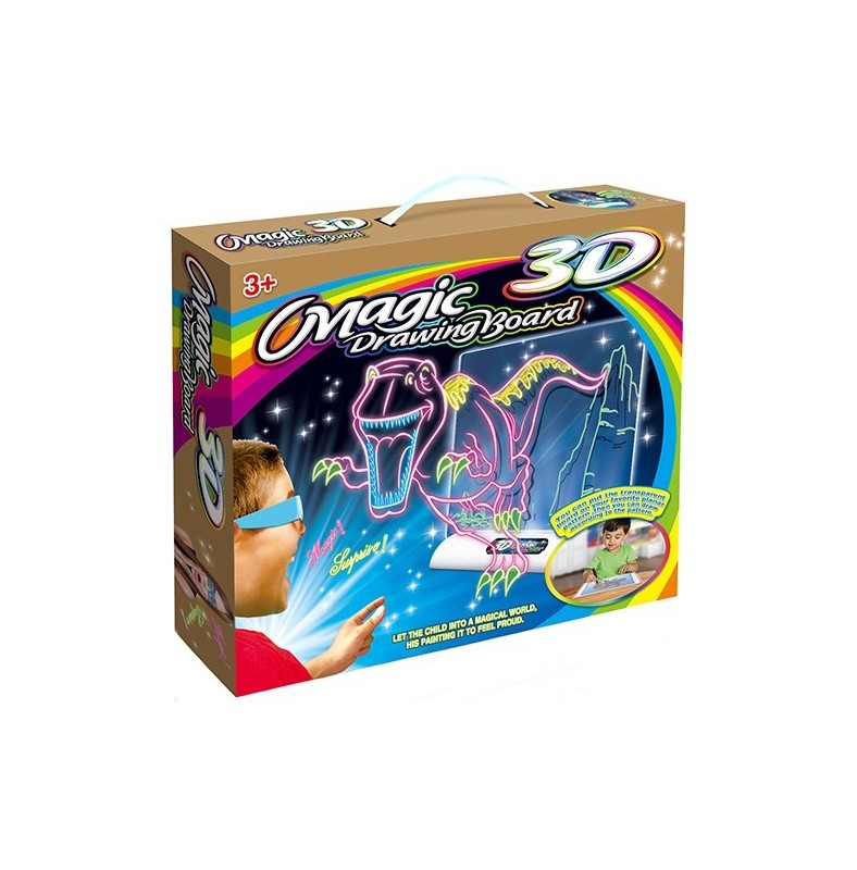 Tabla pentru desen 3D Pregateste-te pentru adevarata aventura 3D cu propriile tale desene.Urmariti imaginile dinozaurului pe placa transparenta din plastic, cu stilouri florescente de diferite culori. Apoi plasati placa de plastic pe suportul cu LED-uri. Purtati ochelarii 3D si intrati in Lumea Minunata 3D. Plansa de plastic poate fi stearsa si poate fi folosita din nou.Este nevoie de 4 baterii de 1,5 V - AAA. (neincluse in pachet)Varsta recomandata: 3 ani +Acest produs este fabricat din materiale ecologice.Modelul difera in functie de stoc!
