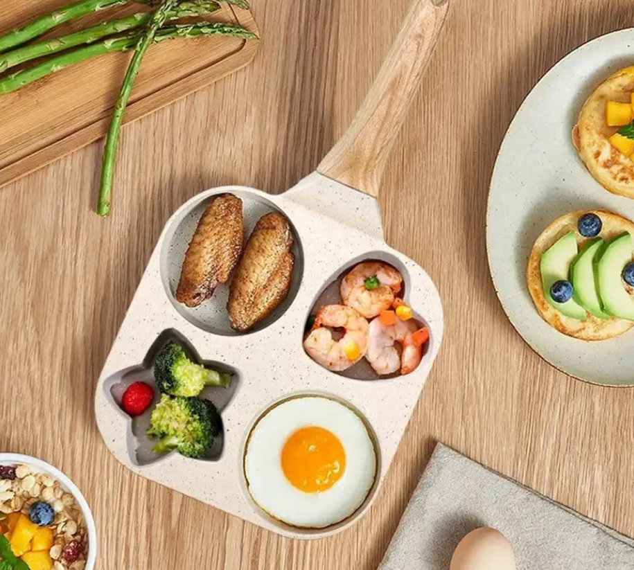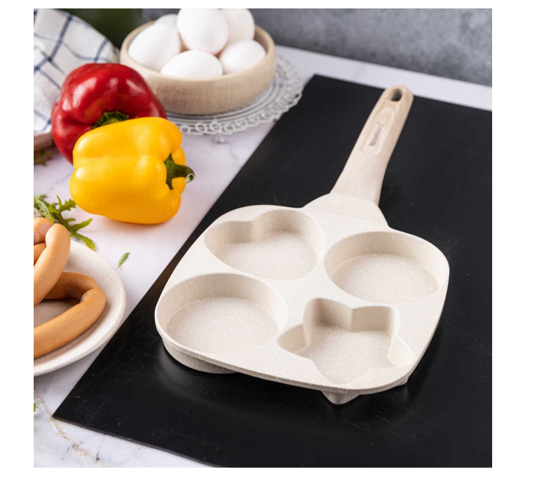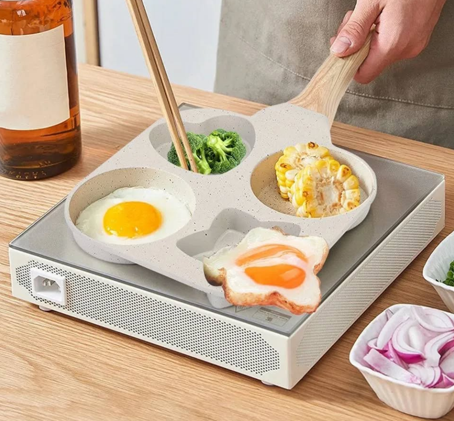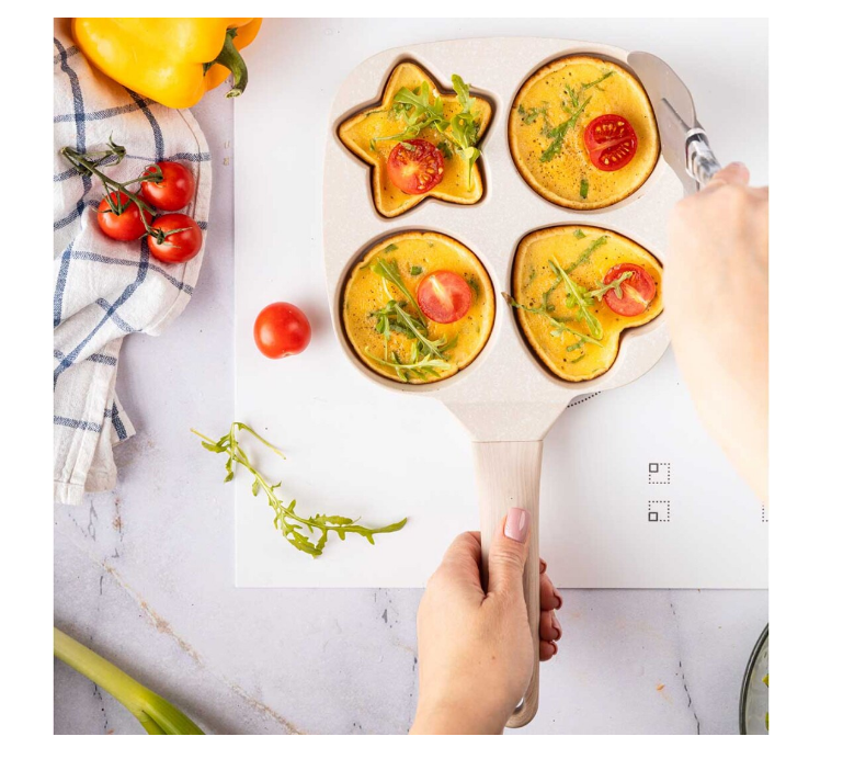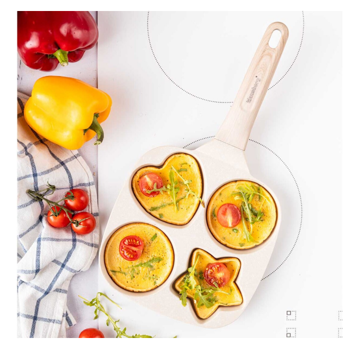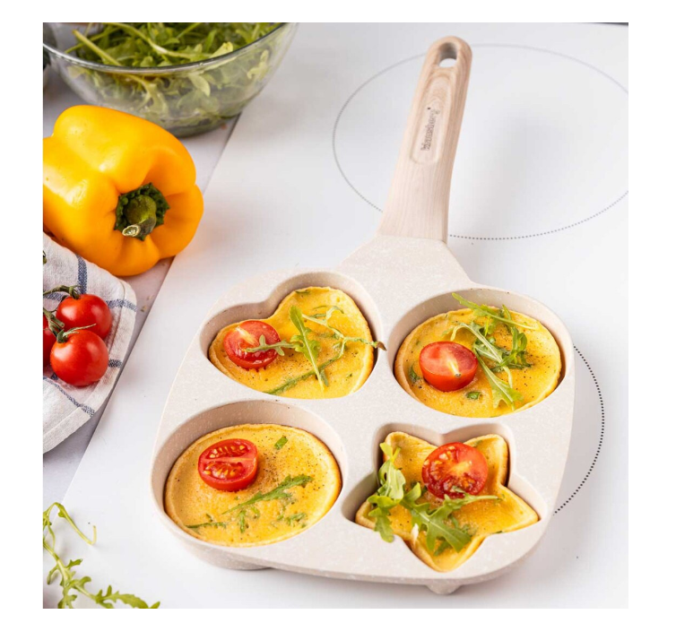 Tigaie impartita in 4 sectiuni pentru prajirea oualor sau clatitelor in diverse forme. Învelișul oferă rezistență ridicată la zgârieturi și proprietăți antiaderențe unice, ceea ce permite prăjirea cu o cantitate minimă de grăsime. Putem praji clatite sau oua in forma de stea, inima sau rotunde in acelasi timp intr-o tigaie.