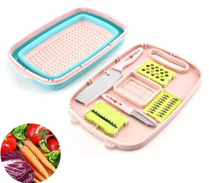 Tocator multifunctional pliabil, 3 razatoare, 2 cutite, cos de legume, strecuratoare